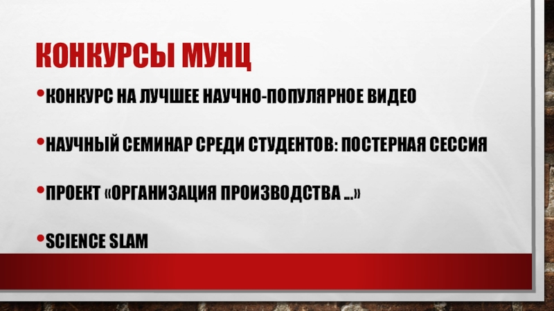 Конкурсы МУНЦКонкурс на лучшее научно-популярное видеоНаучный семинар среди студентов: постерная сессияПроект «Организация производства ...»Science slam