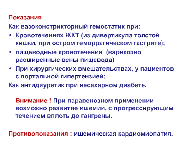 Уменьшает кровоток в селезенке, почках, коже, коронарных артериях;