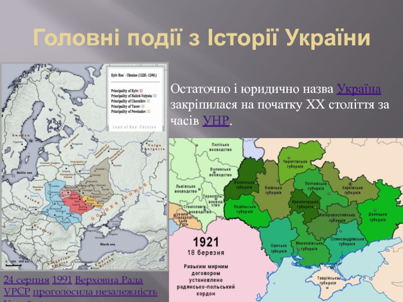 Головні події з Історії УкраїниОстаточно і юридично назва Україна закріпилася на початку ХХ століття за часів УНР.24
