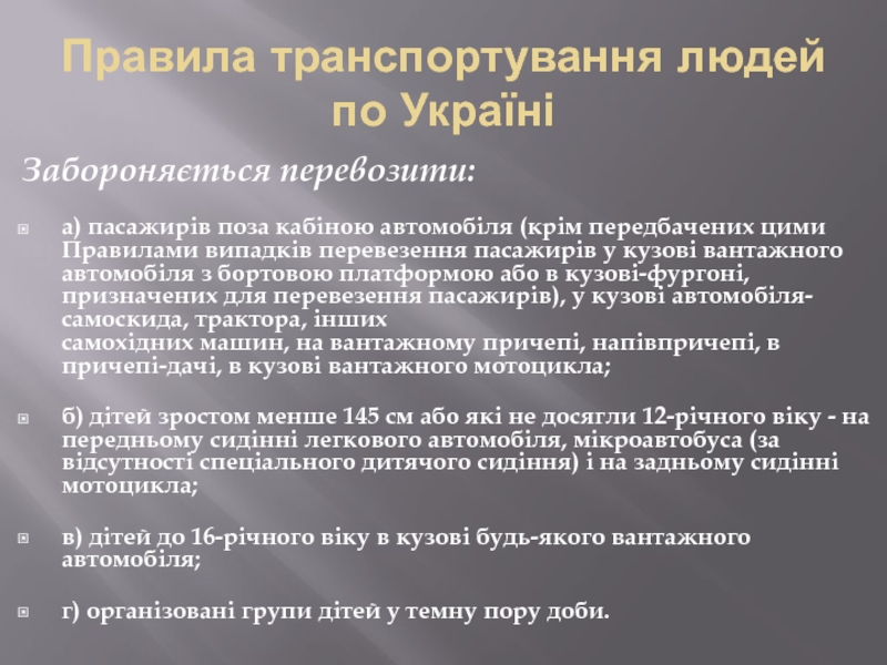 Правила транспортування людей по УкраїніЗабороняється перевозити:  а) пасажирів поза кабіною автомобіля (крім передбачених цими Правилами випадків