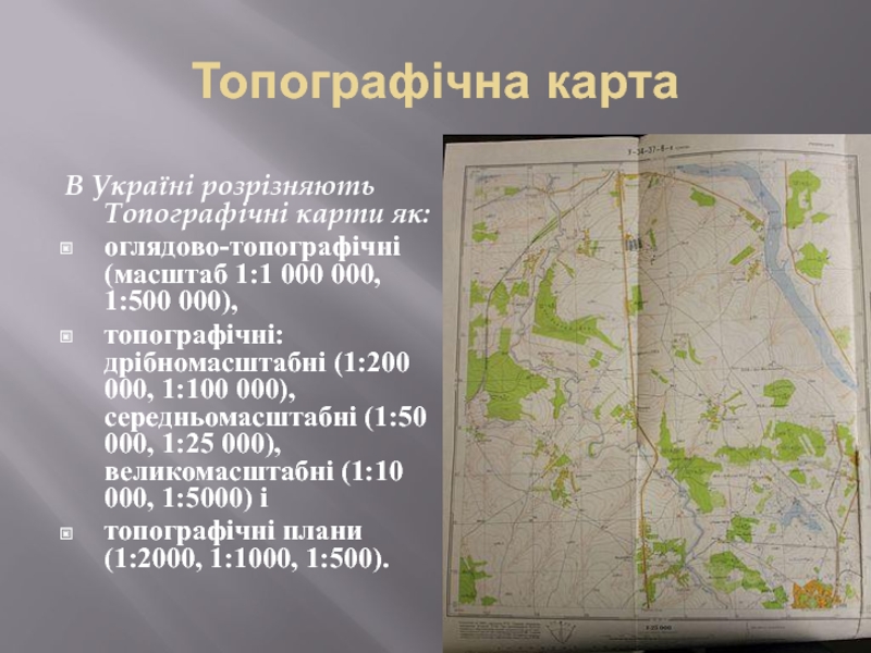 Топографічна картаВ Україні розрізняють Топографічні карти як:оглядово-топографічні (масштаб 1:1 000 000, 1:500 000),топографічні: дрібномасштабні (1:200 000, 1:100