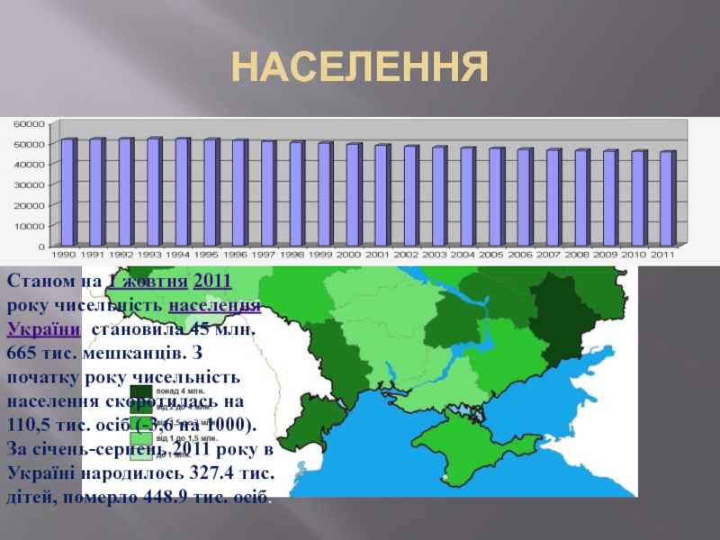 НАСЕЛЕННЯСтаном на 1 жовтня 2011 року чисельність населення України  становила 45 млн. 665 тис. мешканців. З початку