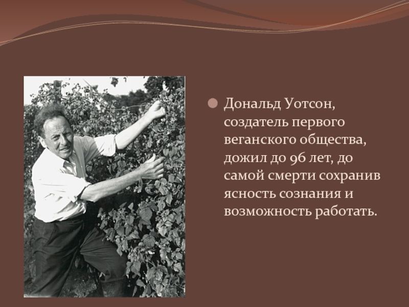 Слайд 7Дональд Уотсон, создатель первого веганского общества, дожил до 96 лет,