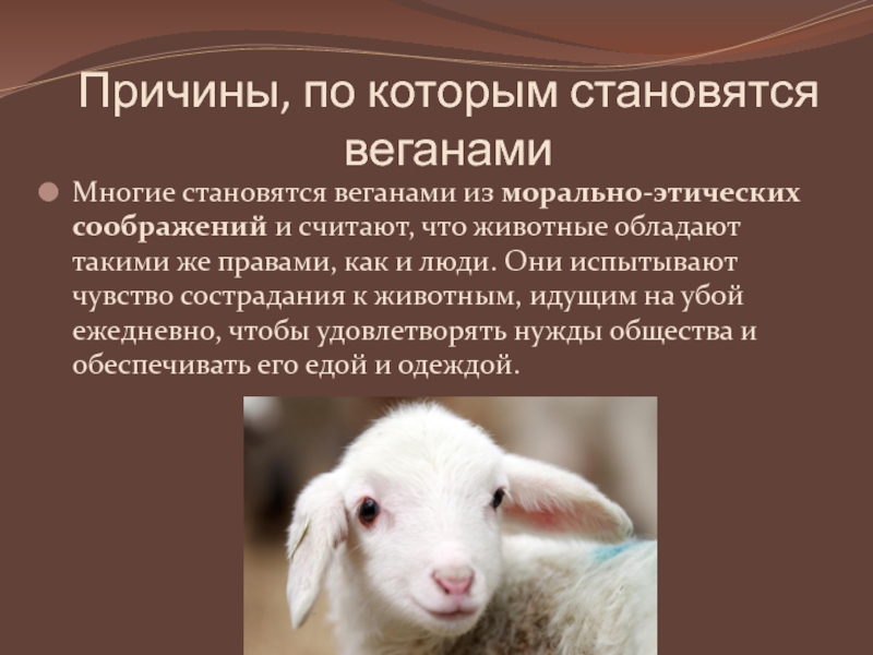люди. Они испытывают чувство сострадания к животным, идущим на убой ежедневно, чтобы удовлетворять нужды общества и обеспечивать его едой и одеждой.