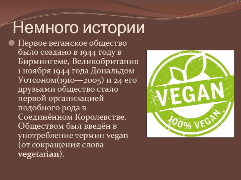 его друзьями общество стало первой организацией подобного рода в Соединённом Королевстве. Обществом был введён в употребление термин vegan (от сокращения слова vegetarian).