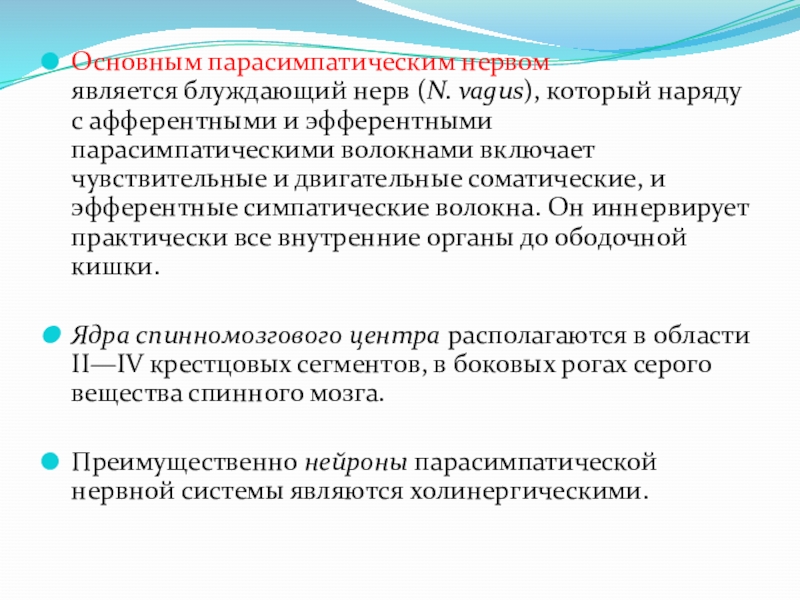 Основным парасимпатическим нервом является блуждающий нерв (N. vagus), который наряду с афферентными и эфферентными парасимпатическими волокнами включает чувствительные