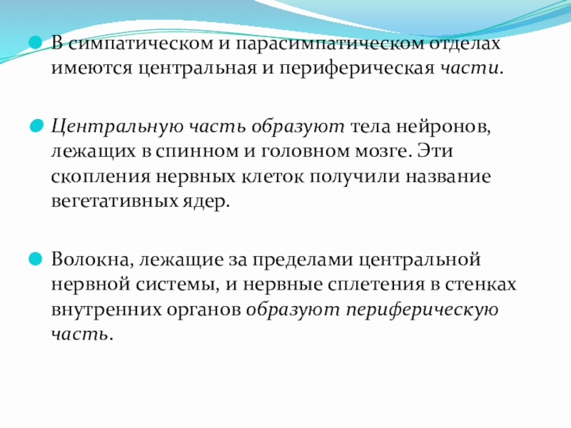 В симпатическом и парасимпатическом отделах имеются центральная и периферическая части. Центральную часть образуют тела нейронов, лежащих в