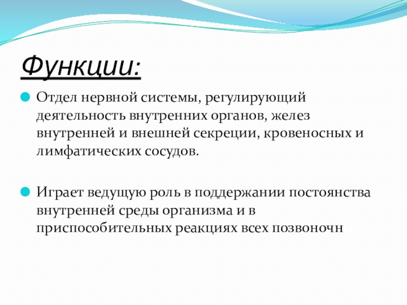 Функции:Отдел нервной системы, регулирующий деятельность внутренних органов, желез внутренней и внешней секреции, кровеносных и лимфатических сосудов. Играет ведущую роль в поддержании постоянства внутренней среды организма и в приспособительных реакциях всех позвоночных.