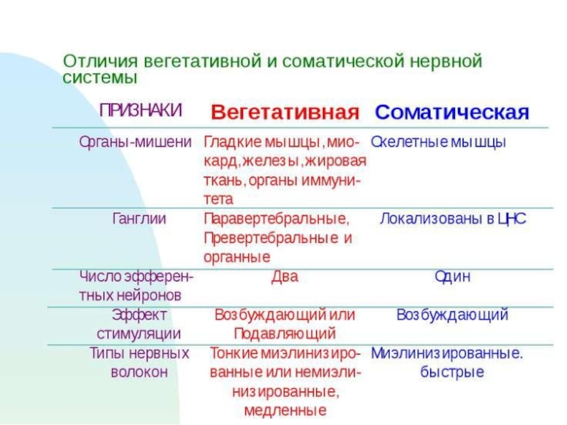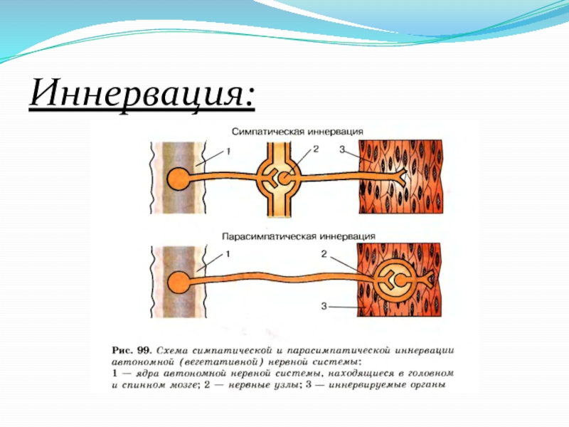 Отделы:Симпатический (усиливает обмен веществ, повышает возбуждаемость большинства тканей, мобилизует силы организма на активную деятельность) Парасимпатический (способствует восстановлению