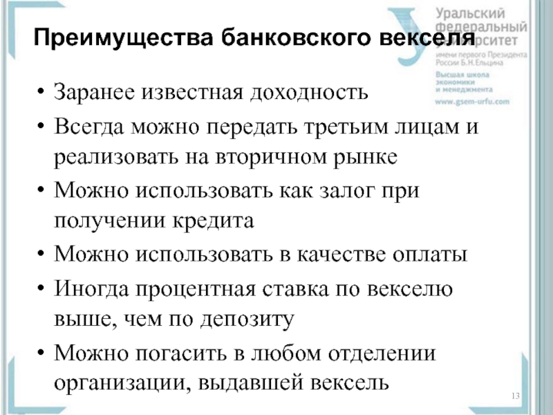 Слайд 13Преимущества банковского векселя