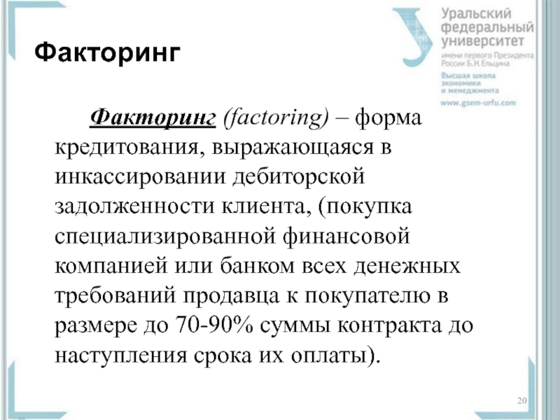 Факторинг (factoring) – форма кредитования, выражающаяся в инкассировании дебиторской задолженности