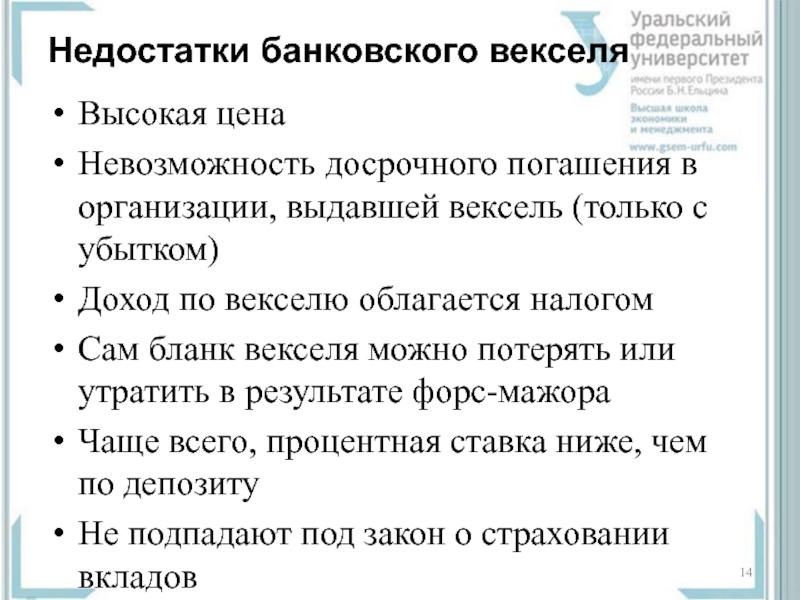 Слайд 14Недостатки банковского векселя