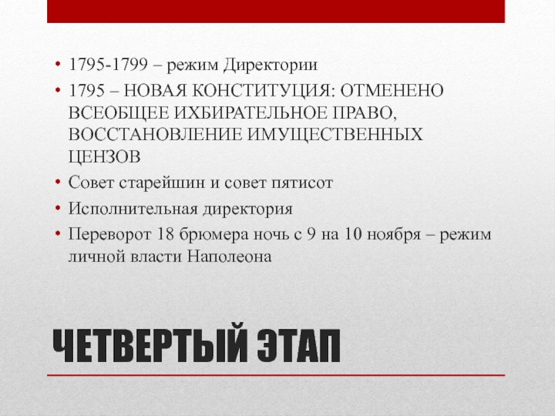 ЧЕТВЕРТЫЙ ЭТАП1795-1799 – режим Директории1795 – НОВАЯ КОНСТИТУЦИЯ: ОТМЕНЕНО ВСЕОБЩЕЕ ИХБИРАТЕЛЬНОЕ ПРАВО, ВОССТАНОВЛЕНИЕ ИМУЩЕСТВЕННЫХ ЦЕНЗОВСовет старейшин и