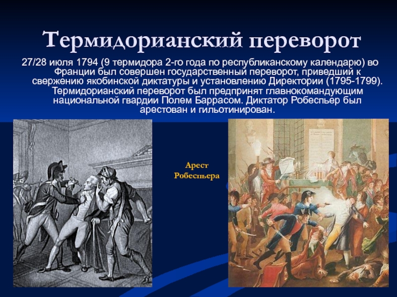якобинской диктатуры и установлению Директории (1795-1799). Термидорианский переворот был предпринят главнокомандующим национальной гвардии Полем Баррасом. Диктатор Робеспьер был арестован и гильотинирован.
