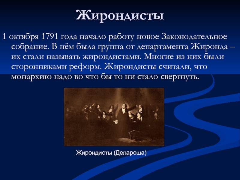 жирондистами. Многие из них были сторонниками реформ. Жирондисты считали, что монархию надо во что бы то ни стало свергнуть.
