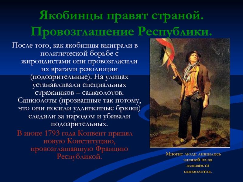 На улицах устанавливали специальных стражников – санкюлотов. Санкюлоты (прозванные так потому, что они носили удлиненные брюки) следили за народом и убивали подозрительных.