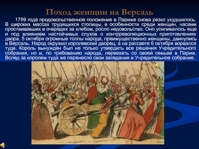 женщин, часами простаивавших в очередях за хлебом, росло недовольство. Оно усиливалось еще и под влиянием настойчивых слухов о контрреволюционных приготовлениях двора. 5 октября огромные толпы народа, преимущественно женщины, двинулись в Версаль. Народ окружил королевский дворец, а на рассвете 6 октября ворвался туда. Король вынужден был не только утвердить все решения Учредительного собрания, но и, по требованию народа, переехать со своей семьей в Париж. Вслед за королем туда же перенесло свои заседания и Учредительное собрание.