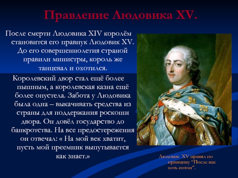 Королевский двор стал ещё более пышным, а королевская казна ещё более опустела. Забота у Людовика была одна – выкачивать средства из страны для поддержания роскоши двора. Он довёл государство до банкротства. На все предостережения он отвечал: « На мой век хватит, пусть мой преемник выпутывается как знает.»