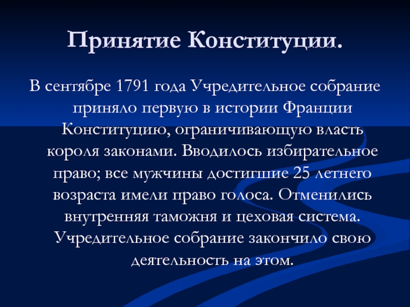 истории Франции Конституцию, ограничивающую власть короля законами. Вводилось избирательное право;