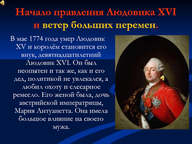 Слайд 7Начало правления Людовика XVI и ветер больших перемен.