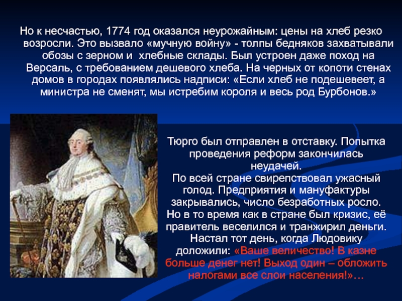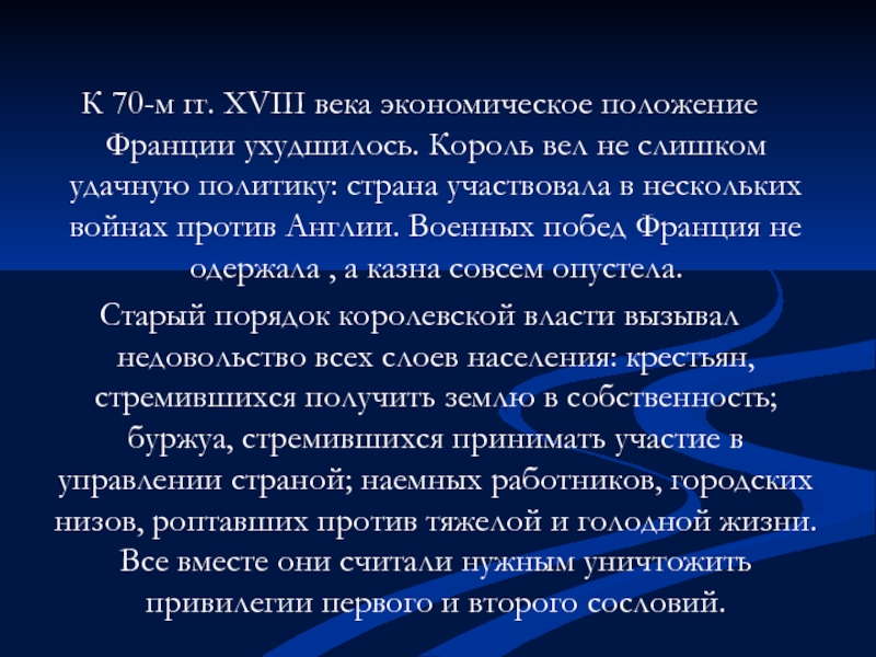 К 70-м гг. XVIII века экономическое положение Франции ухудшилось. Король