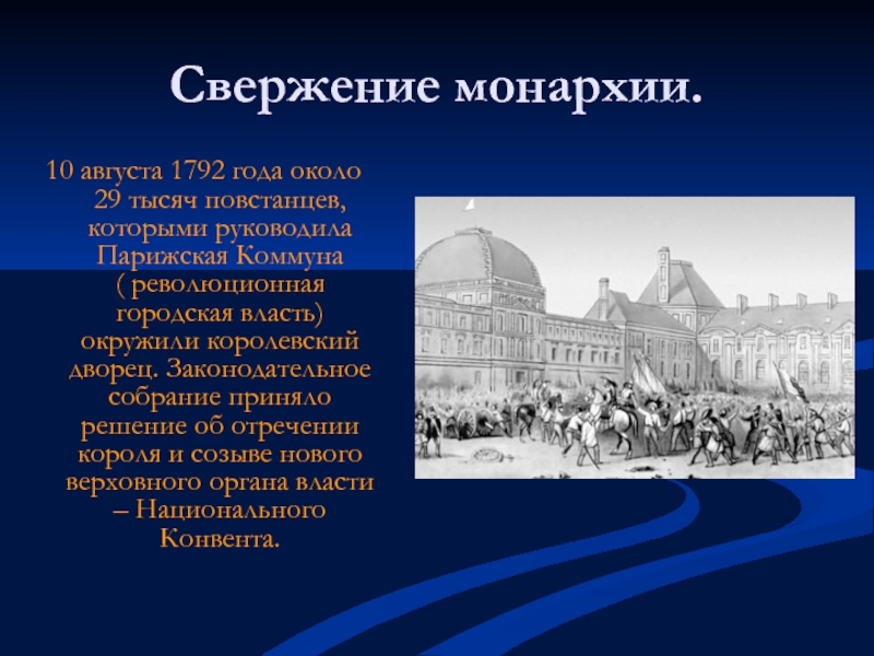 власть) окружили королевский дворец. Законодательное собрание приняло решение об отречении короля и созыве нового верховного органа власти – Национального Конвента.