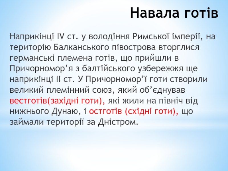 з балтійського узбережжя ще наприкінці II ст. У Причорномор’ї готи створили великий племінний союз, який об’єднував вестготів(західні готи), які жили на північ від нижнього Дунаю, і остготів (східні готи), що займали території за Дністром.