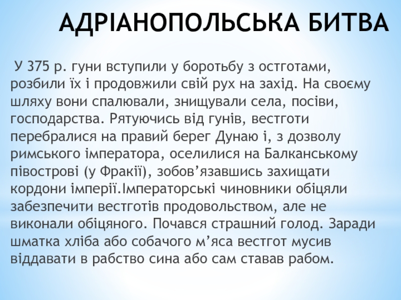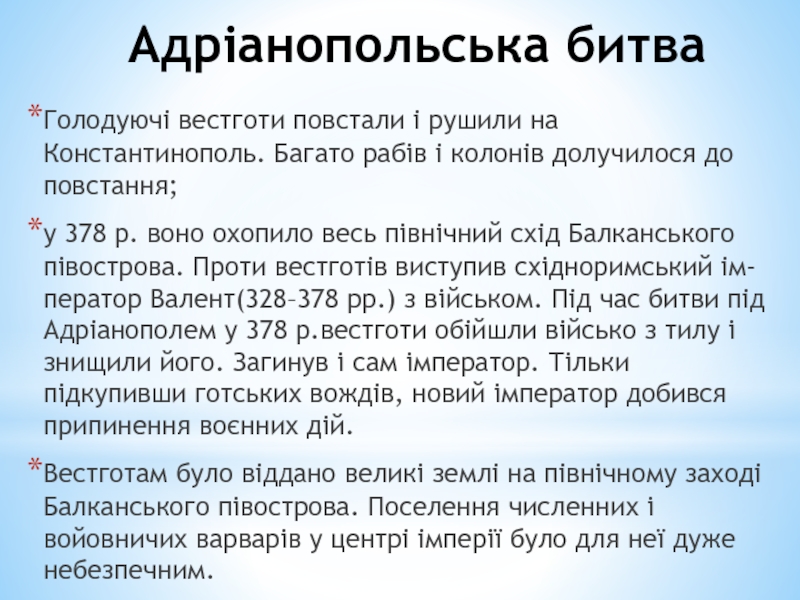 весь північний схід Балканського півострова. Проти вестготів виступив східноримський ім-ператор Валент(328–378 рр.) з військом. Під час битви під Адріанополем у 378 р.вестготи обійшли військо з тилу і знищили його. Загинув і сам імператор. Тільки підкупивши готських вождів, новий імператор добився припинення воєнних дій.