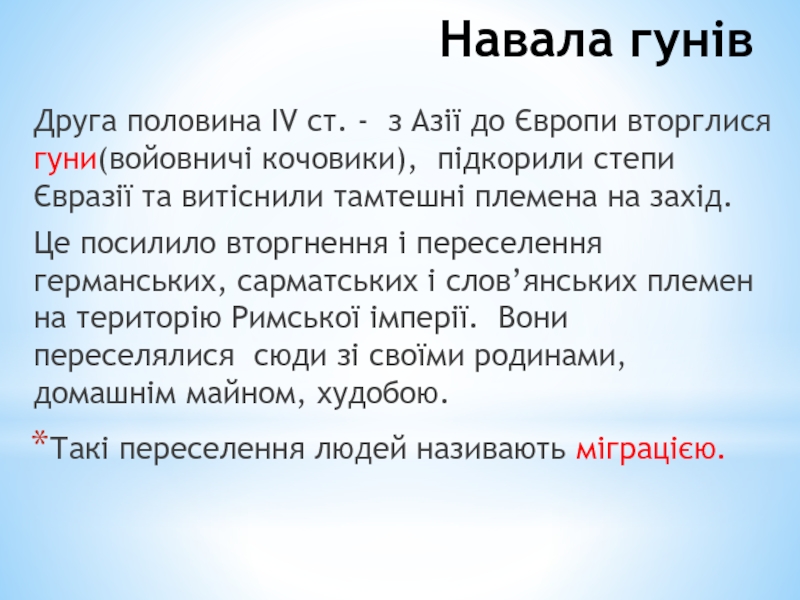 Європи вторглися гуни(войовничі кочовики), підкорили степи Євразії та витіснили тамтешні