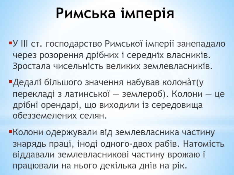 набував колонàт(у перекладі з латинської — землероб). Колони — це дрібні орендарі, що виходили із середовища обезземелених селян.