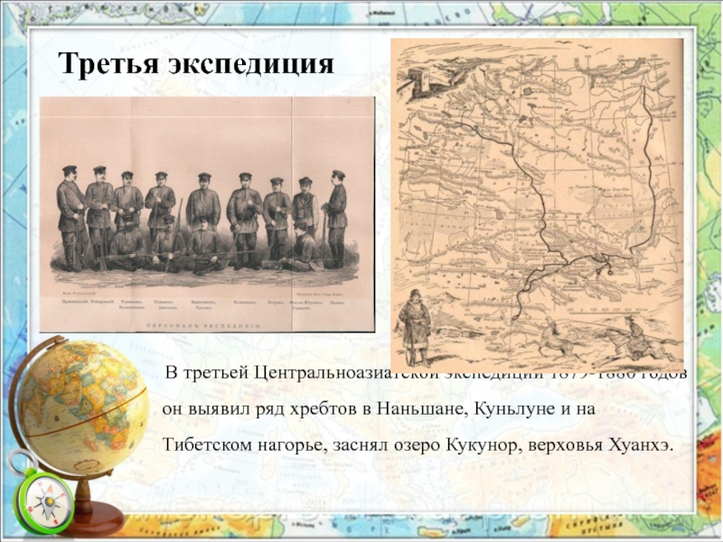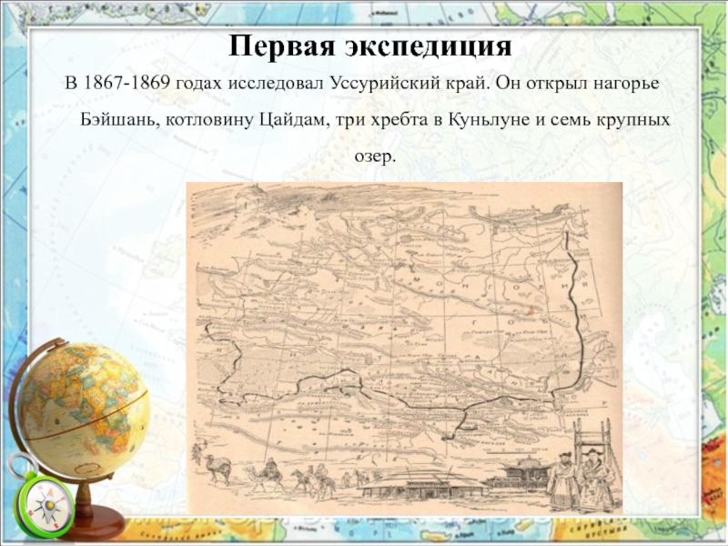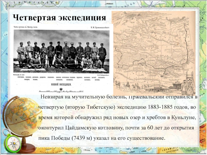 которой обнаружил ряд новых озер и хребтов в Куньлуне, оконтурил Цайдамскую котловину, почти за 60 лет до открытия пика Победы (7439 м) указал на его существование.
