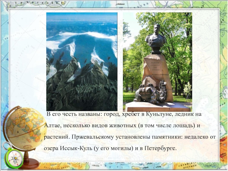лошадь) и растений. Пржевальскому установлены памятники: недалеко от озера Иссык-Куль (у его могилы) и в Петербурге.