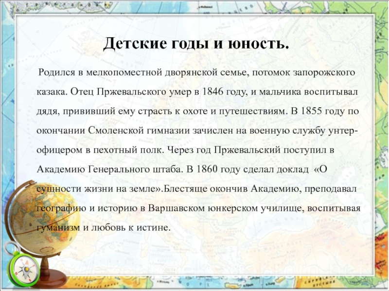 и мальчика воспитывал дядя, прививший ему страсть к охоте и путешествиям. В 1855 году по окончании Смоленской гимназии зачислен на военную службу унтер-офицером в пехотный полк. Через год Пржевальский поступил в Академию Генерального штаба. В 1860 году сделал доклад «О сущности жизни на земле».Блестяще окончив Академию, преподавал географию и историю в Варшавском юнкерском училище, воспитывая гуманизм и любовь к истине.