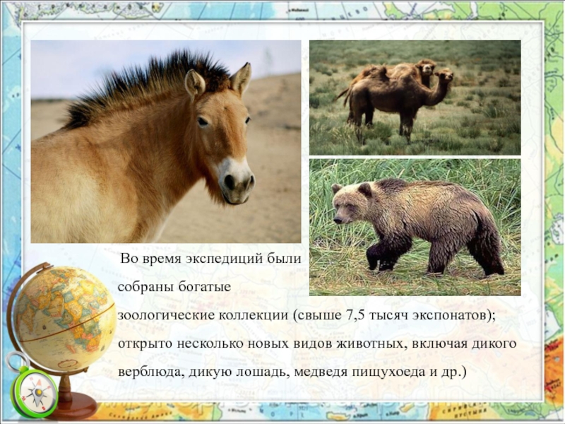 собраны богатые зоологические коллекции (свыше 7,5 тысяч экспонатов); открыто несколько новых видов животных, включая дикого верблюда, дикую лошадь, медведя пищухоеда и др.)