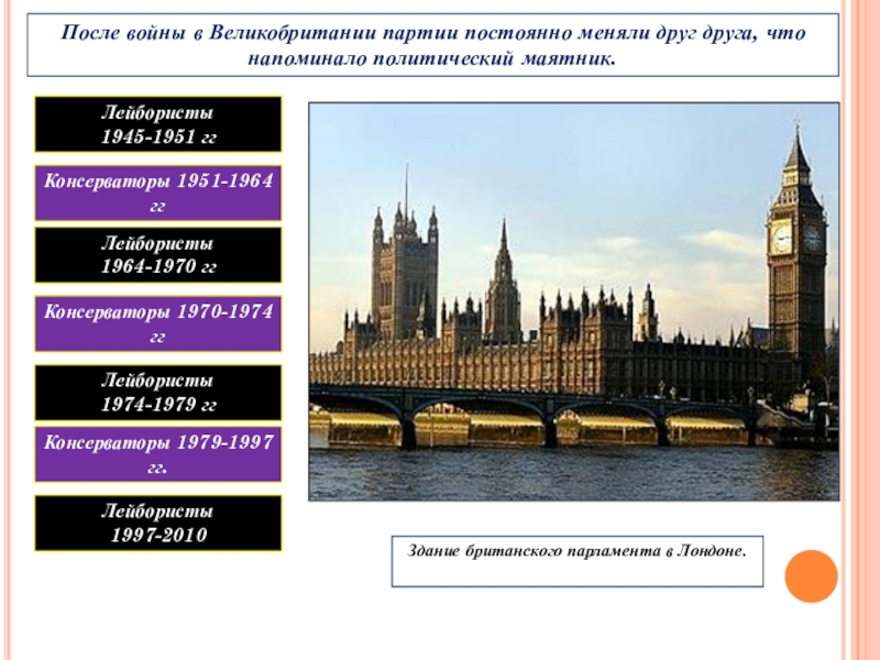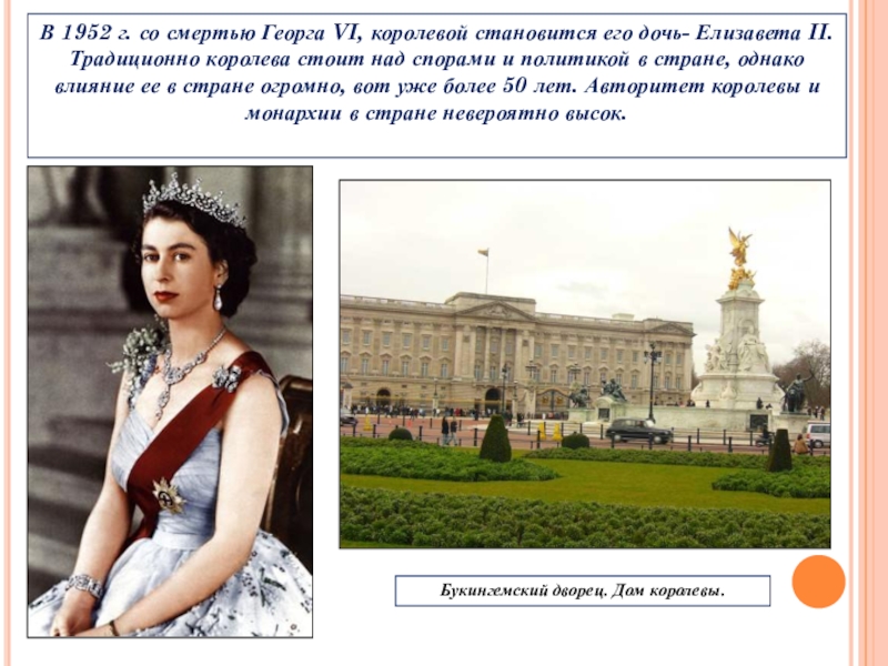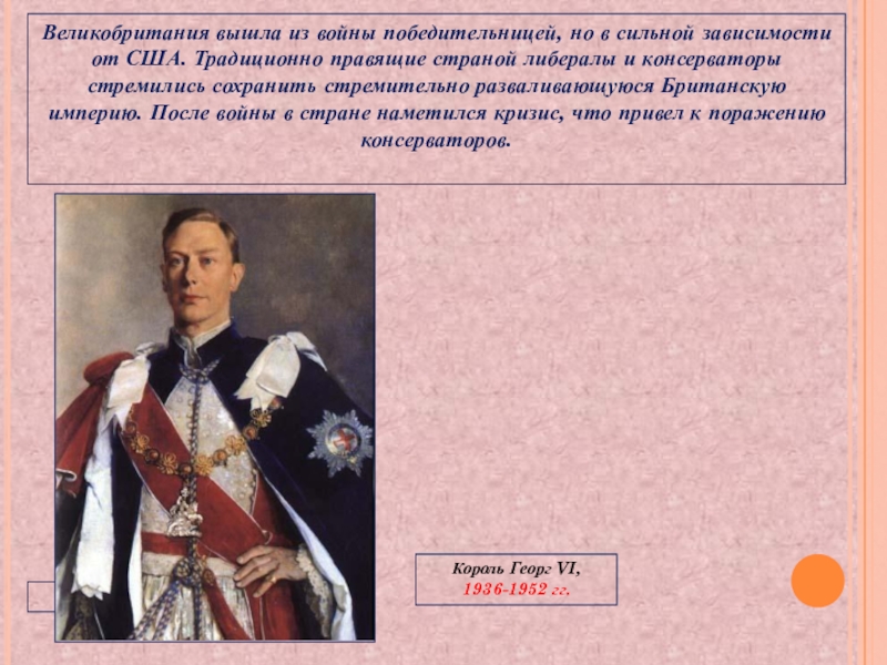 разваливающуюся Британскую империю. После войны в стране наметился кризис, что привел к поражению консерваторов.Король Георг VI, 1936-1952 гг.