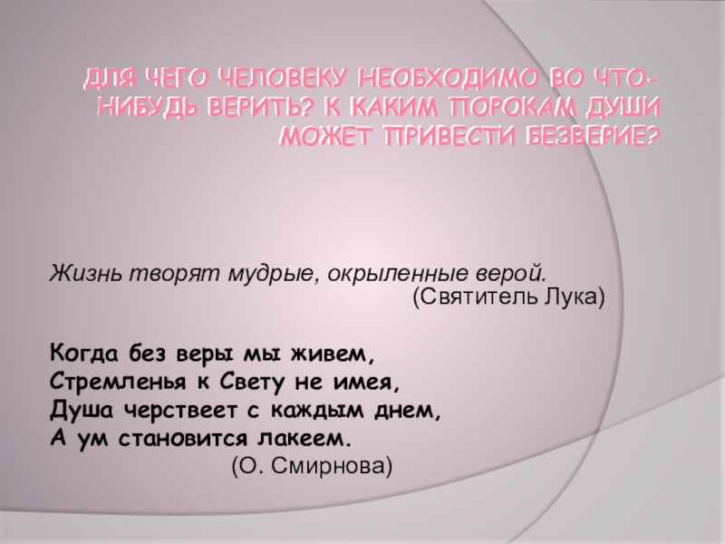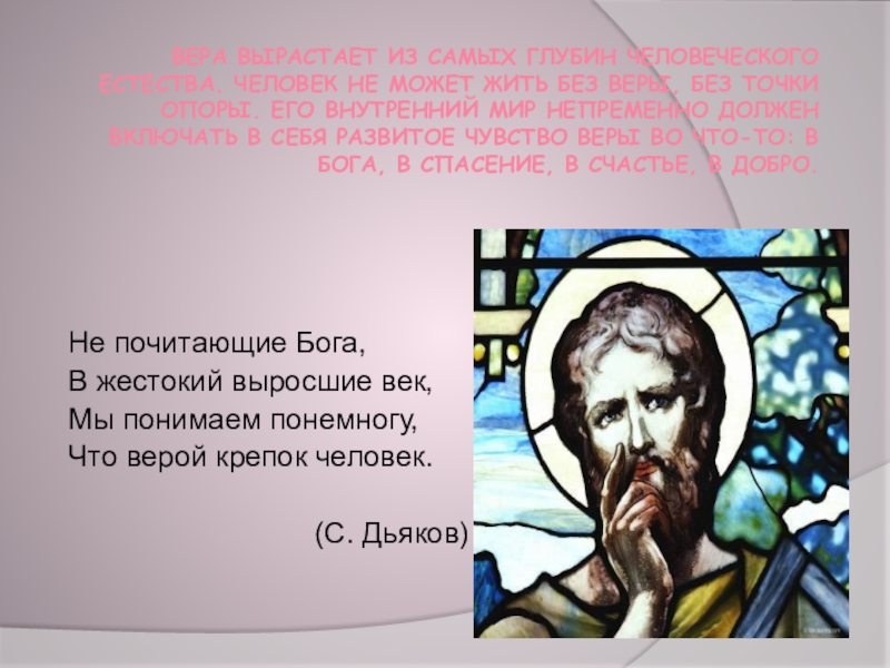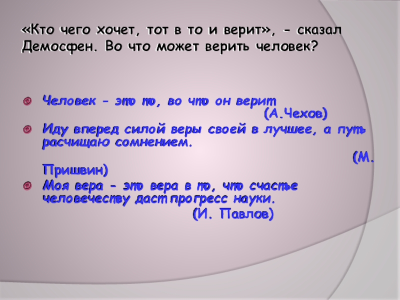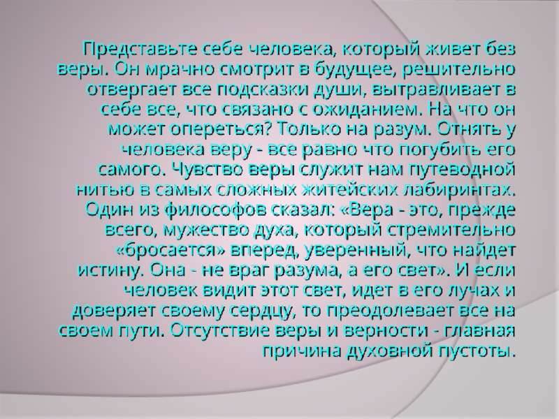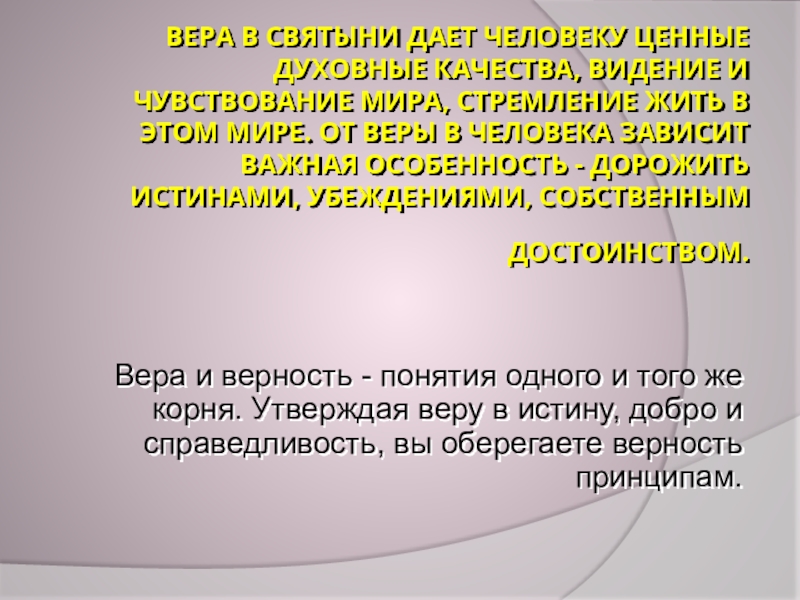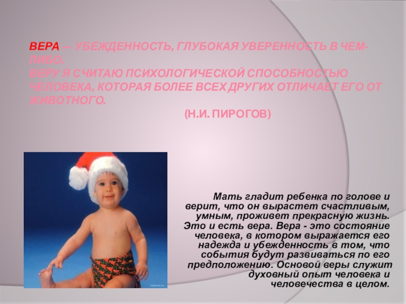 (Н.И. Пирогов)Мать гладит ребенка по голове и верит, что он вырастет счастливым, умным, проживет прекрасную жизнь. Это и есть вера. Вера - это состояние человека, в котором выражается его надежда и убежденность в том, что события будут развиваться по его предположению. Основой веры служит духовный опыт человека и человечества в целом.