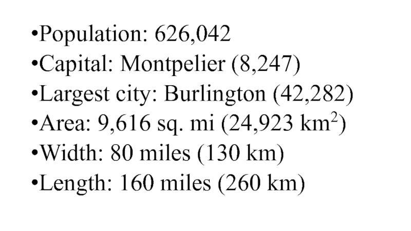 Population: 626,042Capital: Montpelier (8,247)Largest city: Burlington (42,282)Area: 9,616 sq. mi (24,923 km2)Width: 80 miles (130 km)Length: 160 miles (260 km)