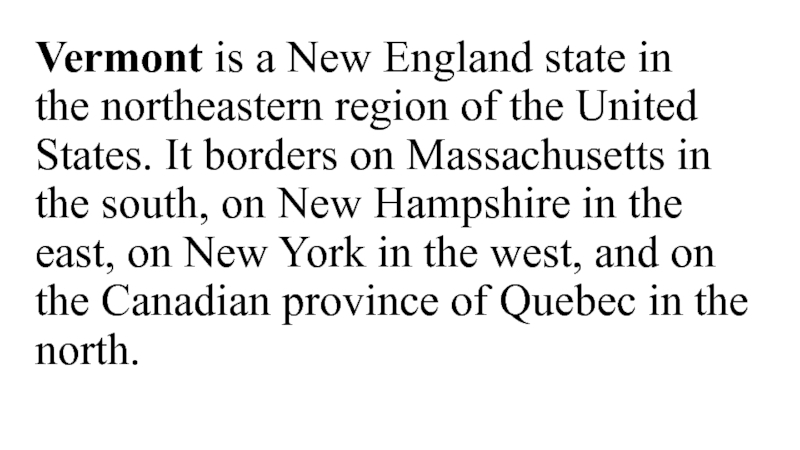 Слайд 4Vermont is a New England state in the northeastern region of the United States. It