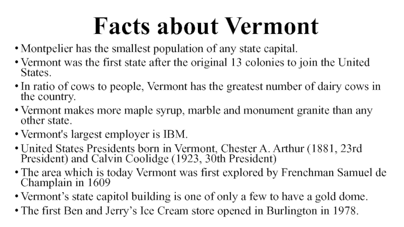 Facts about VermontMontpelier has the smallest population of any state capital.Vermont was the first state after the