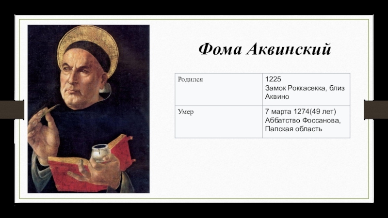 Слайд 1Вершина европейской схоластики: Фома Аквинский: жизнь и учение (соотношение веры