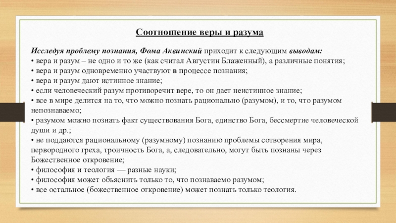 • не поддаются рациональному (разумному) познанию проблемы сотворения мира, первородного греха, троичность Бога, а, следовательно, могут быть познаны через Божественное откровение;