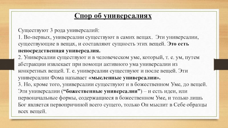 2. Универсалии существуют и в человеческом уме, который, т. е. ум, путем абстракции извлекает при помощи активного ума универсалии из конкретных вещей. Т. е. универсалии существуют и после вещей. Эти универсалии Фома называет «мысленные универсалии».