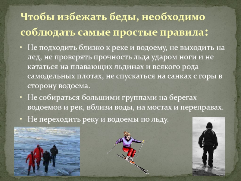 льда ударом ноги и не кататься на плавающих льдинах и всякого рода самодельных плотах, не спускаться на санках с горы в сторону водоема.