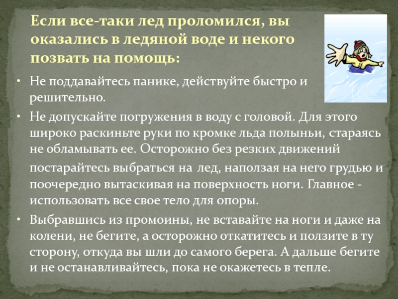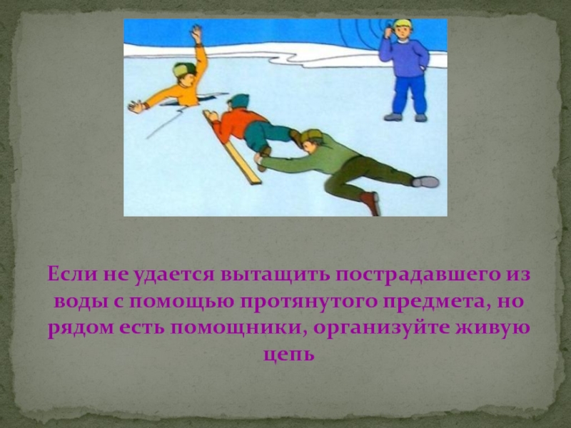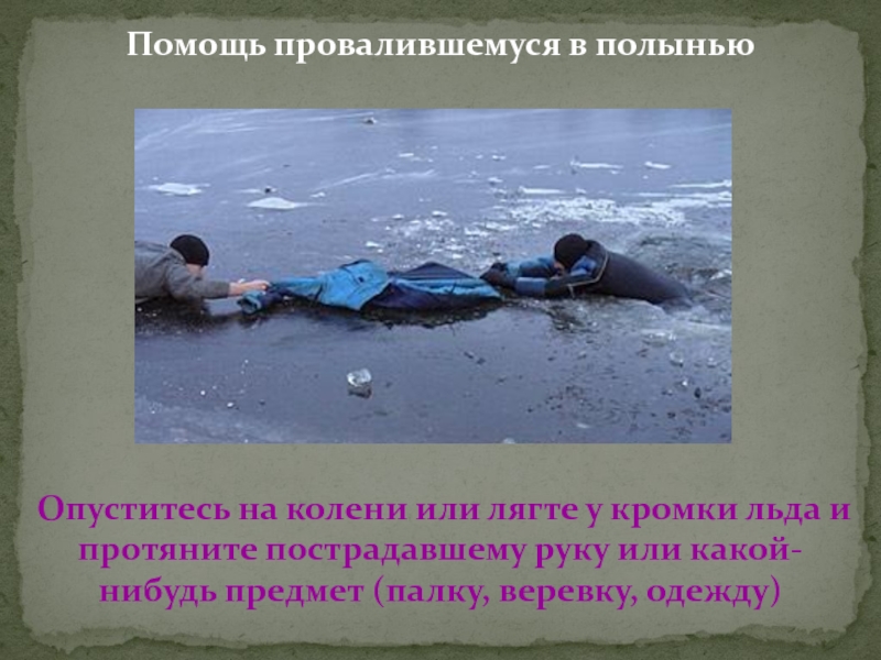 льда и протяните пострадавшему руку или какой-нибудь предмет (палку, веревку,