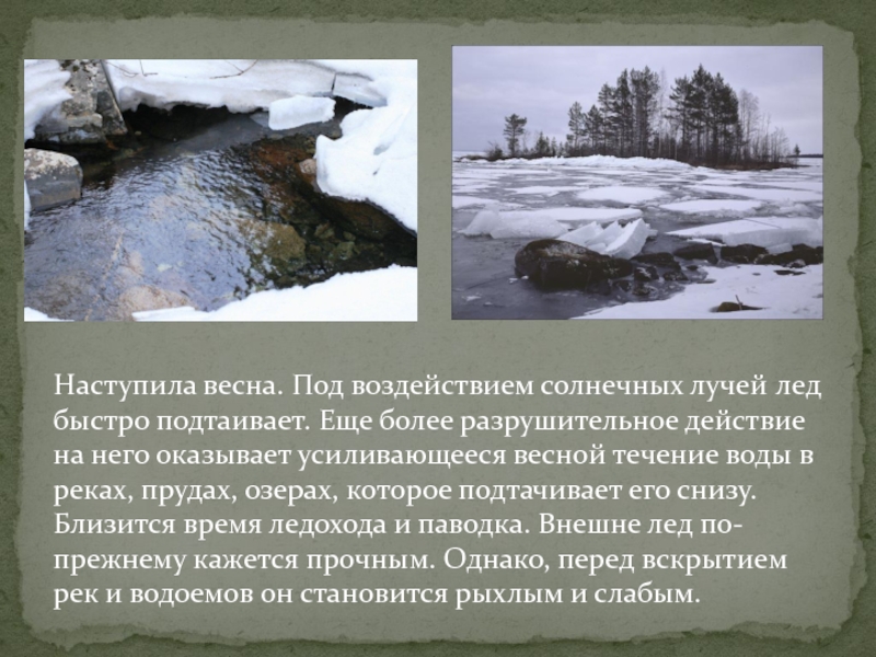 в реках, прудах, озерах, которое подтачивает его снизу. Близится время ледохода и паводка. Внешне лед по-прежнему кажется прочным. Однако, перед вскрытием рек и водоемов он становится рыхлым и слабым.