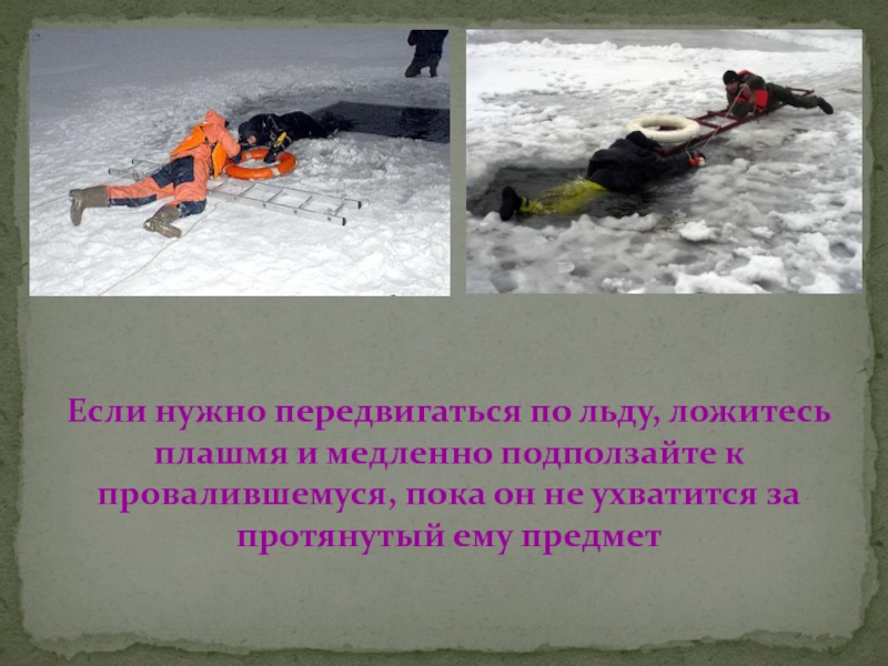 Слайд 8Если нужно передвигаться по льду, ложитесь плашмя и медленно подползайте
