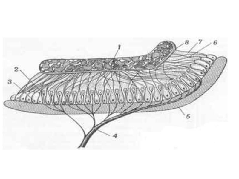 2 типа клеток: сенсорно-эпителиальные (волосковые)