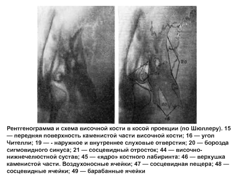 Слайд 40Рентгенограмма и схема височной кости в косой проекции (по Шюллеру).