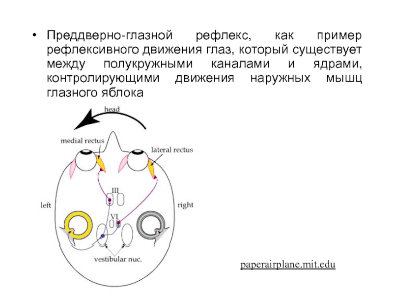 Слайд 38Преддверно-глазной рефлекс, как пример рефлексивного движения глаз, который существует между