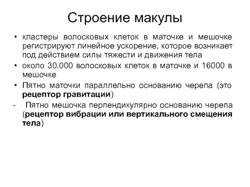 - Пятно мешочка перпендикулярно основанию черепа (рецептор вибрации или вертикального смещения тела)